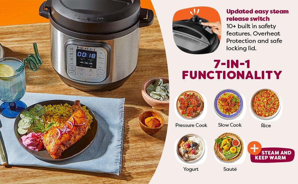 The Instant Pot Duo 7-in-1 Electric Pressure Cooker has gained immense popularity among home cooks due to its remarkable versatility and ability to streamline cooking processes. This innovative kitchen appliance combines functionalities of seven essential appliances, including a pressure cooker, slow cooker, rice cooker, steamer, sauté pan, food warmer, and yogurt maker, thereby significantly reducing the need for multiple devices. This multifunctionality not only saves kitchen space but also enhances efficiency in meal preparation.